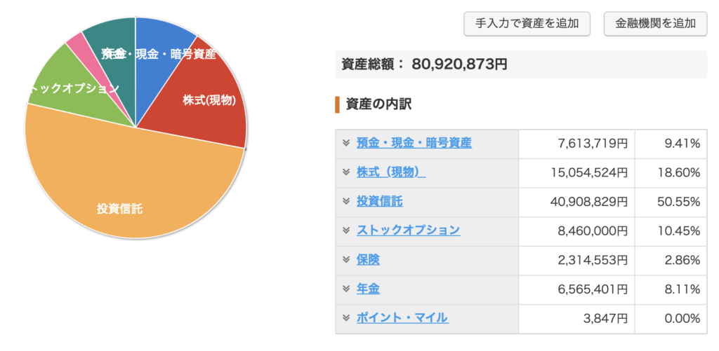 2026年2月4日時点のマネーフォワードのキャプチャ画像です。(※ストックオプション・保険は手入力となっており、時々更新しています)
