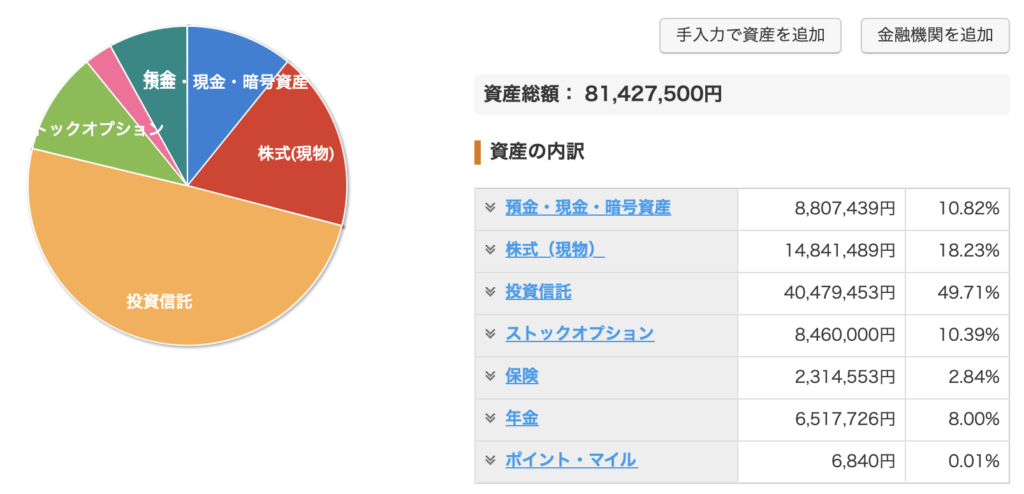 2026年1月13日時点のマネーフォワードのキャプチャ画像です。(※ストックオプション・保険は手入力となっており、時々更新しています)